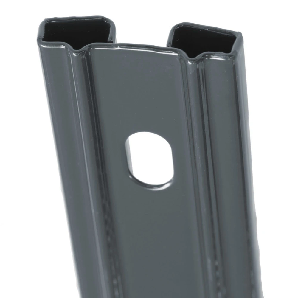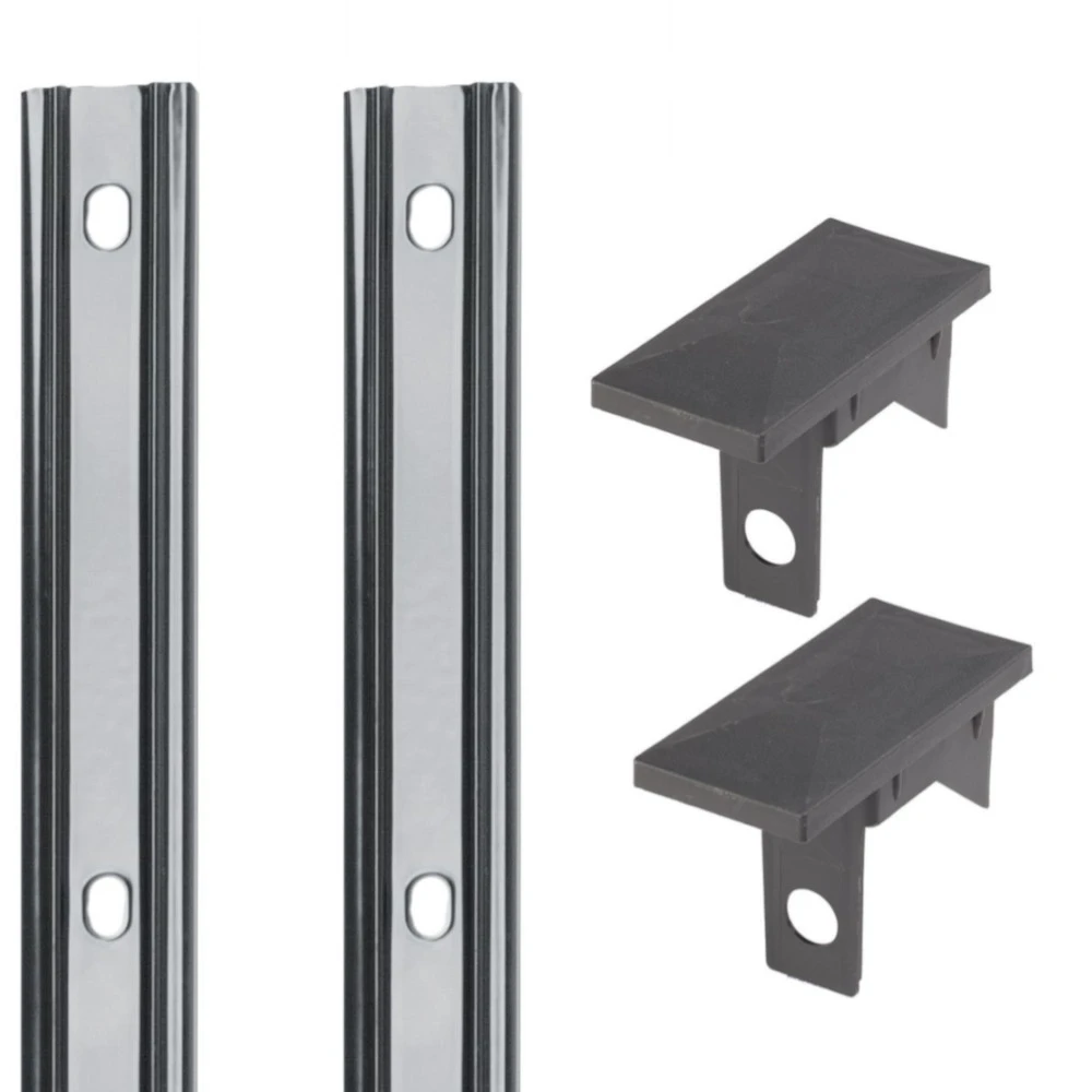 Abdeckleiste und Pfostenkappe (je 2 Stück) für den Zaunpfosten Typ P-Fix in der Farbe anthrazit. Die Abdeckleiste ist verzinkt und pulverbeschichtet, die Pfostenkappe aus Kunststoff. Die Abdeckleiste besitzt eine Länge von 1230 mm und hat fünf Befestigungspunkte. Die Abdeckleisten haben nach der Montage einen kleinen Überstand, der mit der mitgelieferten Pfostenkappe kaschiert wird.