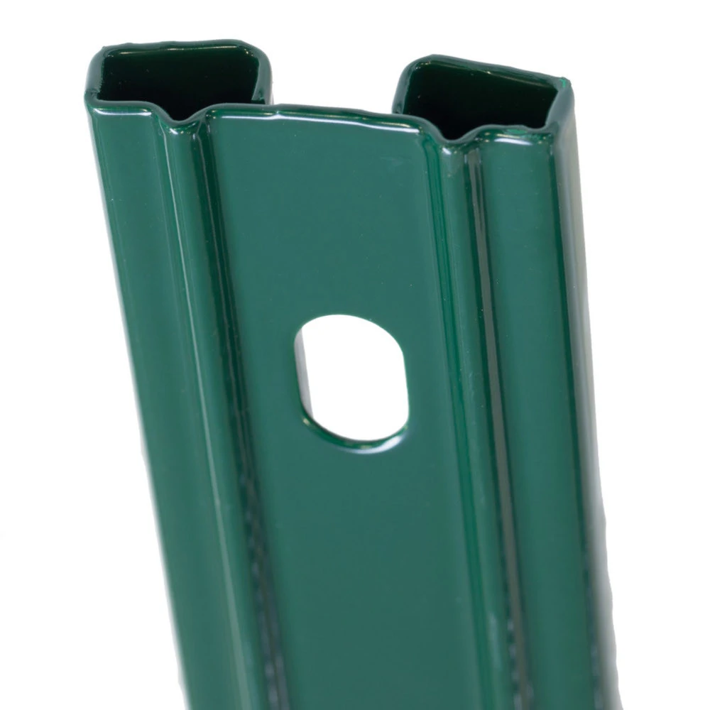 Abdeckleiste und Pfostenkappe (je 2 Stück) für den Zaunpfosten Typ P-Fix in der Farbe moosgrün. Die Abdeckleiste ist verzinkt und pulverbeschichtet, die Pfostenkappe aus Kunststoff. Die Abdeckleiste besitzt eine Länge von 800 mm und hat drei Befestigungspunkte. Die Abdeckleisten haben nach der Montage einen kleinen Überstand, der mit der mitgelieferten Pfostenkappe kaschiert wird.
