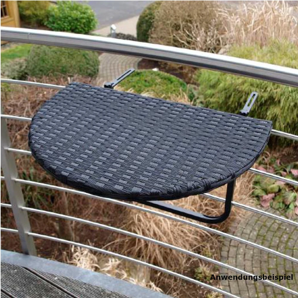 Balkonhängetisch mit Metallgestell und Polyrattanbespannung in Schwarz. Dieser Balkontisch ist wie gemacht für ein romantisches Frühstück zu zweit auf dem Balkon mit frisch gepresstem Orangensaft. Das stabile Metallgestell kann einfach am Balkon bzw an Brüstungen bis zu einer Dicke von ca. 15 cm angebracht werden. Die schwarze Bespannung aus Polyrattan ist nicht nur optisch ein echter Hingucker, sondern auch sehr stabil und robust.