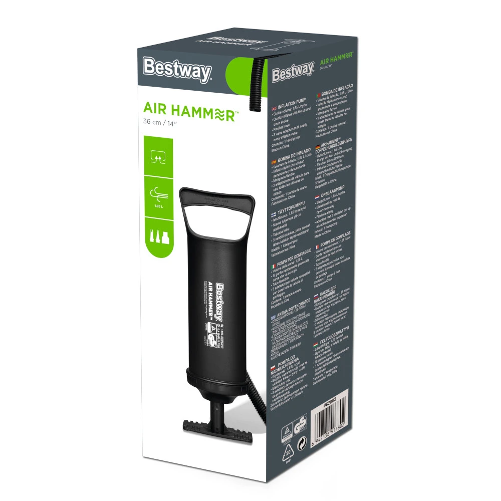 Mit der Air Hammer Handpumpe von Bestway lassen sich Schwimmringe, Luftbetten, Schlauchboote und andere Aufblasartikel problemlos aufpumpen und entlüften. Die Auf- und Abbewegung ermöglicht einen konstanten Luftstrom und die größtmögliche Pumpleistung. Im Lieferumfang sind außerdem drei Universalanschlüsse für Ventile enthalten.
