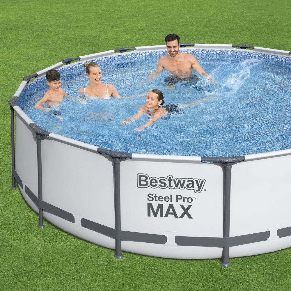 Es gibt kaum etwas Schöneres, als einen eigenen Pool im Garten zu haben! Das Aufstellbecken Steel Pro MAX von Bestway ist besonders langlebig. Dabei sorgt das FrameLink-System des korrosionsbeständigen Stahlrahmens für die Stabilität und eine sichere Verbindung der Rahmenelemente. Die Schwimmbeckenauskleidung besteht aus robustem, verstärktem DuraPlus mit enorm widerstandsfähigen, reißfesten Materialeigenschaften. Das Pop-Up-Pool-Set wird mit Filterpumpe, Sicherheitsleiter und Poolabdeckung geliefert. Der Auf- und Abbau sowie die Lagerung außerhalb der Badesaison sind kinderleicht. Ein Gartenschlauch, der an das integrierte Ventil angeschlossen wird, lässt das Wasser schnell und bequem ablaufen – ganz ohne Werkzeug. Verbringe deinen Sommer im kühlen Nass mit dem Steel Pro MAX Pool von Bestway!