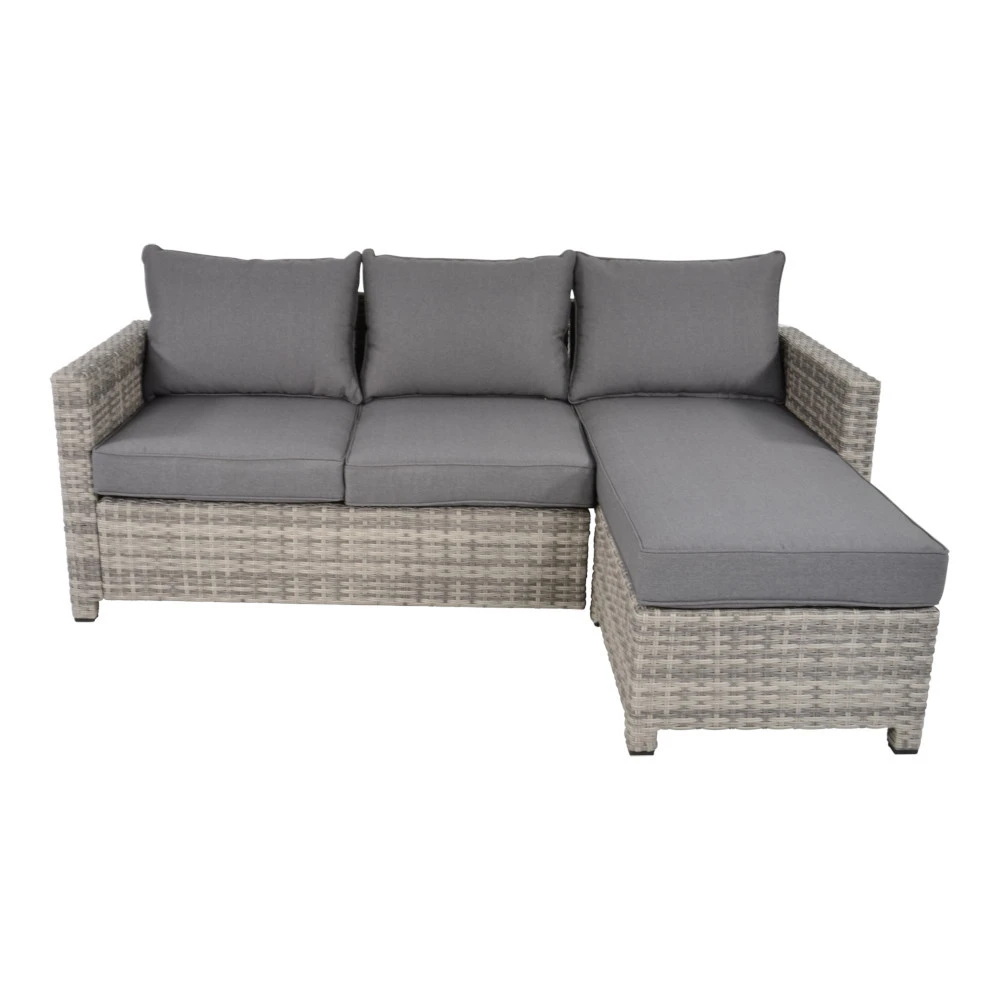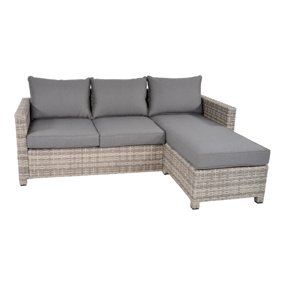 Garten-Lounge-Set Valencia Smoke aus wetterfesten Materialien. Die Loungegarnitur besteht aus einer bequemen Lounge KD Sofa mit Armlehne, einem angebauten 2-Sitzer Sofa. Für alle Teile werden gemütliche Polster mitgeliefert.