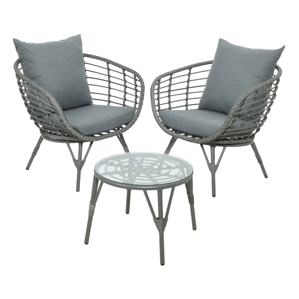 Dieses wunderschöne 2-Sitzer-Lounge-Set ist perfekt für einen erholsamen Nachmittag in deinem Garten und eignet sich für alle Gartentypen. Das Set ist ebenso stilvoll wie bequem und besteht aus zwei Sesseln mit niedriger Rückenlehne, die beide mit UV-beständigen, besonders weichen Sitz- und Rückenkissen aus Polyester im Vintage-Look ausgestattet sind. Vervollständigt wird das Set durch einen Couchtisch mit Geflechtgestell und Platte aus gehärtetem Glas. Das Gestell ist aus pulverbeschichtetem Eisen und die bequemen Polyesterkissen sind mit Seidenwatte und Schaumstoff gefüllt.