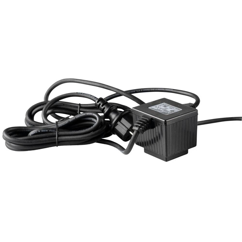 - sein 230 V Trafo reguliert den benötigten Strom aus der Steckdose auf nur 12 V