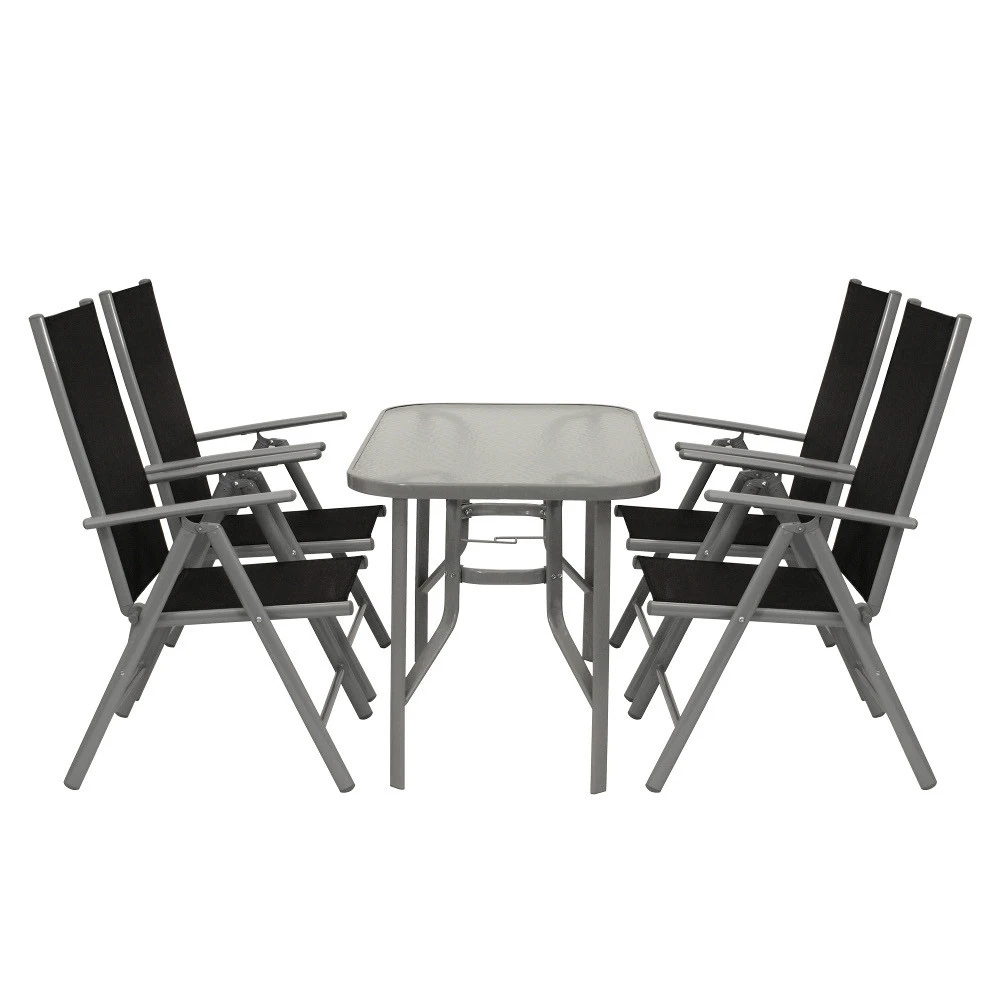 Gartensitzgruppe für 5 Personen aus Aluminium. Das Gartenmöbel-Set besteht aus 4 Klappsesel und einem Glastisch. Die Gartensessel haben ein solides Alugestell, eine Wetterfeste Textilbespannung und eine verstellbare Rückenlehne. Bei Nichtgebrauch lassen sie sich zusammenklappen und platzsparend verstauen. Der robuste Tisch mit Metallgestell hat eine Tischplatte aus strukturiertem Sicherheitsglas. Die Gartengarnitur hat ein Gesamtgewicht von ca. 32,7 kg.