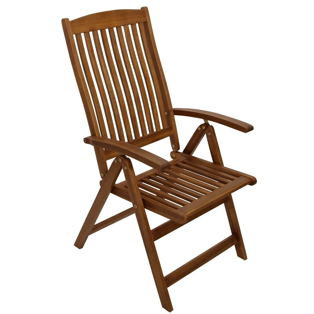 Gartenstuhl-Hochlehner aus geöltem Akazienholz. Die hohe Rückenlehne des Gartensessels ist 5-fach verstellbar, sodass immer eine angenehme Position zum Sitzen oder Liegen eingenommen werden kann. Das Holz des Klappstuhls stammt aus nachhaltigem Anbau und wurde umweltschonen geerntet.