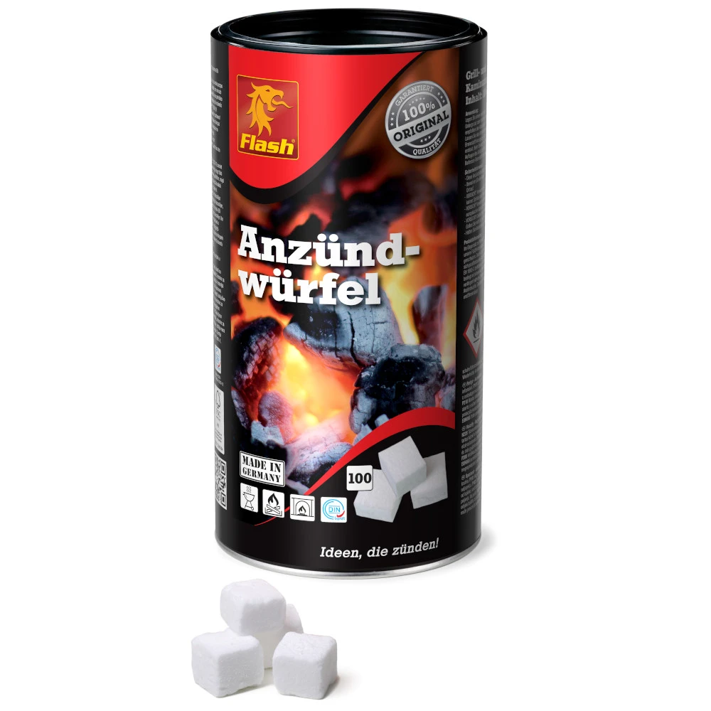 Grill- oder Kaminanzünder auf Paraffinbasis, vollkommen geruchlos und einzeln entnehmbar. 100 Stück in der praktischen Aufbewahrungsdose. Holzkohle Anzündhilfe mit hoher Zündkraft, sauberer Flamme, hergestellt in Deutschland.