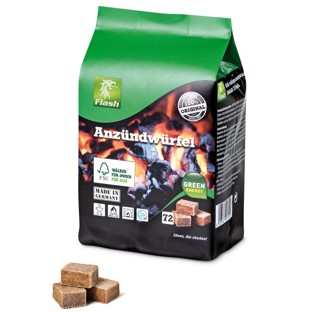 Mit diesem Grillanzünder steht dem Grillvergnügen nichts mehr im Weg. Die 72 Stück Feueranzünder in Würfelformsind aus Sägespäne von Nadelhölzern und Paraffin zusammengesetzt und daher sehr umweltfreundlich. Zum Anschüren reicht der Gebrauch von 3-4 Würfel aus. Diese Anzündhilfe zeichnet sich außerdem durch ihre Geruchsneutralität aus. Sobald der Anzünder vollständig abgebrannt ist, kann das Grillgut auflegen und das Grillspektakel beginnen. Hergestellt in Deutschland.