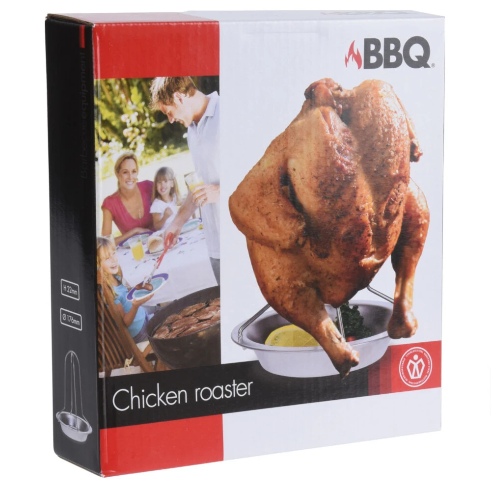 Der Hähnchengrill aus robustem Edelstahl ist ein praktischer Helfer für knusprige Hähnchen und einen sauberen Ofen. Einfach das gewürzte Hähnchen auf den Bräter stecken und schon kann er entweder auf dem Grill gestellt oder in den Backofen geschoben werden. Durch das Gestell wird für eine gleichmäßige Hitzeverteilung außerhalb und im inneren des Grillguts gesorgt. Dank der Abtropfschale wird das Fett aufgefangen und hält das Grillrost beziehungsweise den Ofen sauber.
