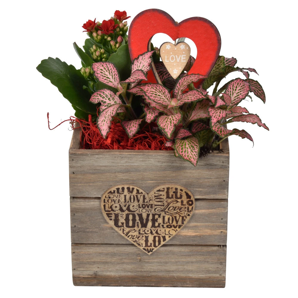 Holzgefäß viereckig mit Blumen bepflanzt und dekoriert