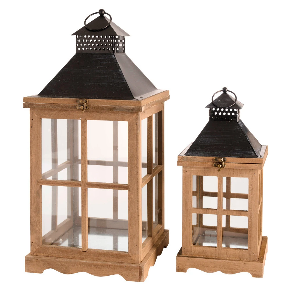 Laterne aus Kiefernholz/MDF mit Echtglaseinsatz, 2er Set