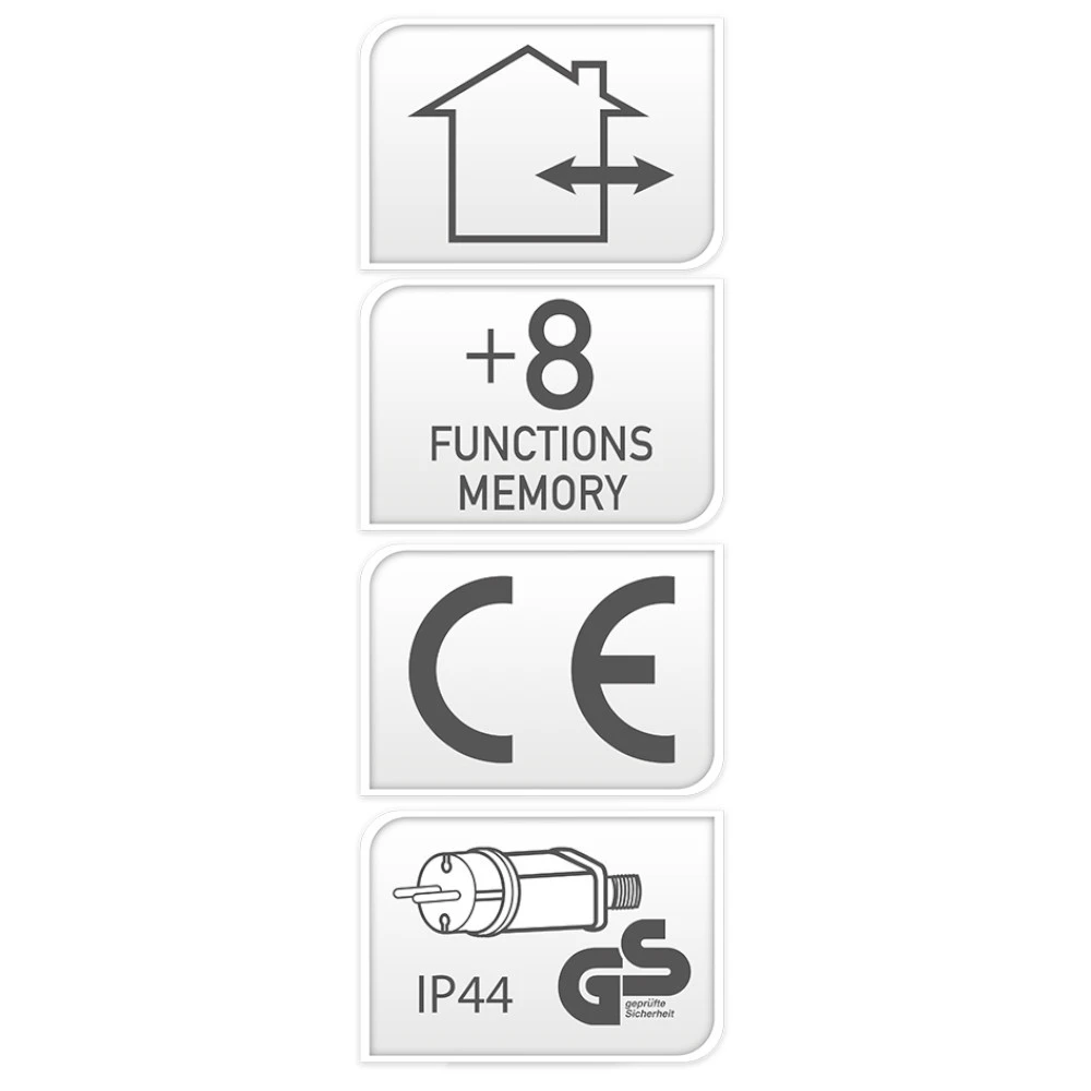 - mit spritzwassergeschütztem Stecker-Netzteil für die Nutzung im geschützten Aussenbereich