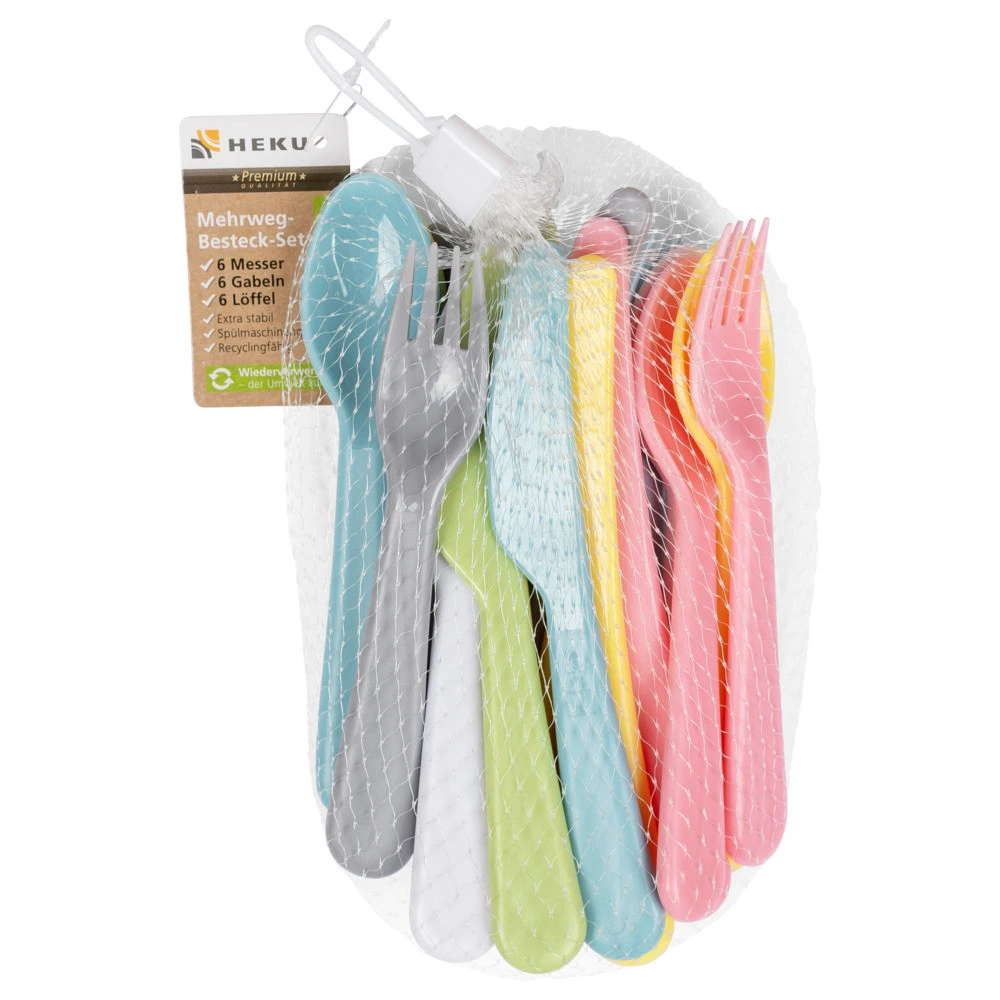 Das bunte Mehrweg-Besteck eignet sich hervorragend für Veranstaltungen, beim Camping und im Wohnmobil. Es beinhaltet jeweils sechs Messer, Löffel und Gabel und ist aus stabilem Kunststoff. Nach dem Gebrauch lässt sich das Geschirr schnell und einfach reinigen und bei Bedarf wiederverwenden. Ist auch Spülmaschinen geeignet.