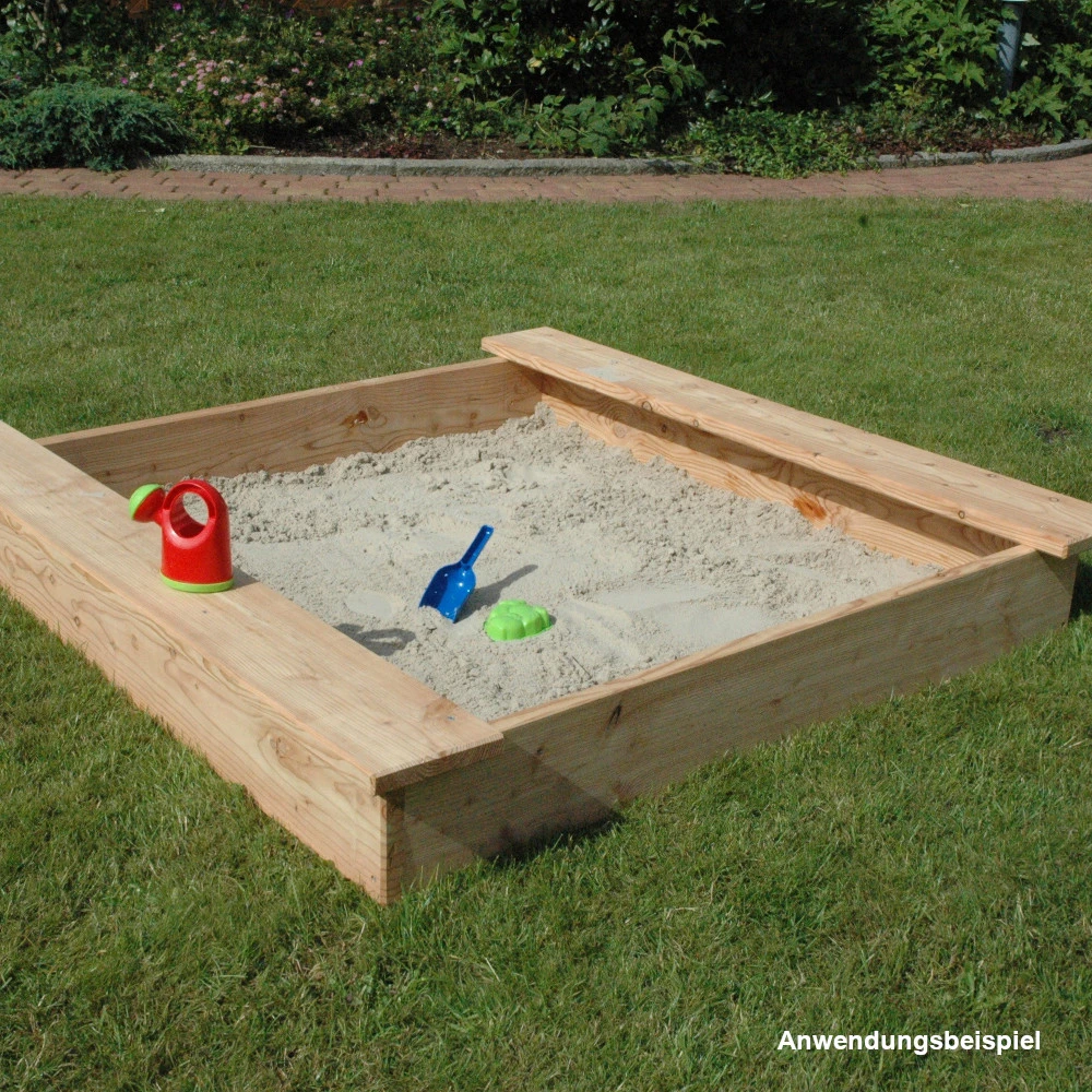 Kinder-Sandkasten mit PVC-Abdeckung aus naturbelassenem Lärchen-Holz. Der Holz-Sandkasten ist die ideale Spielstelle für Kinder zum Sandburgen bauen, buddeln und vieles mehr. Die Abdeckung schützt nach dem Spielen vor Tieren und Laub, sodass der Sand sauber bleibt. Ein weiterer Vorteil der natürlichen Sandkiste ist, dass diese zudem umweltfreundlich ist.