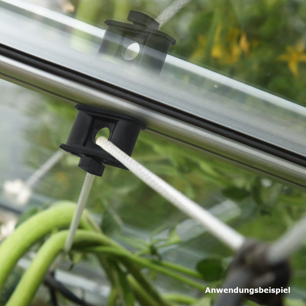 Die flexiblen Pflanzenhalter mit Rautenkopf werden besonders mühelos in das Gewächshaus-Aluminiumprofil eingesetzt. Mittels Einklemmen von Schnüren oder Drähten können z.B. Pflanzen stabilisiert, Schattiergewebe geführt oder faltbare Gewächshauseinrichtungen im zusammengeklappten Zustand fixiert werden. Die Kunststoffösen können auch zur Beeinflussung der Wuchsrichtung von Pflanzen verwendet werden. Im Lieferumfang sind 10 Pflanzenhalter enthalten.