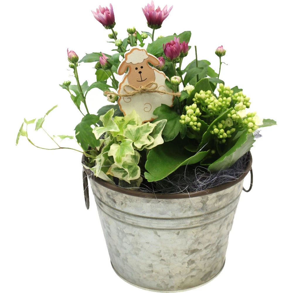 Dieser Zinktopf im Old Look eignet sich zur Dekoration in deinem Innenbereich, besonders zu Ostern. Die Dekoration ist mit 3 Pflanzen und Dekoration versehen.